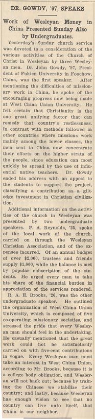 "Dr. Gowdy, '97, Speaks" Wesleyan Argus (29 September 1924)