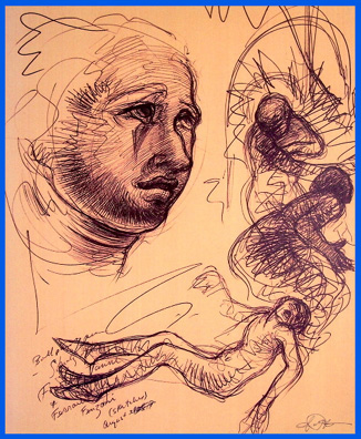 On display in the Day Missions Reading Room from March 20 to April 25 is artwork of Constance Pierce, a former ISM research fellow and Yale Divinity School resident-artist. Pierce is a retired associate professor of art from St. Bonaventure University in New York state. Her sketchbooks were twice featured at the National Museum of Women in the Arts in Washington, D.C. Her art is included in this museum's collection, as well as the Smithsonian Institution's Archives of American Art, the International Marion Research Institute, the National Gallery of Art's rare book library, and the Yale Center for British Art, Prints and Drawings sketchbook archive. She has exhibited for three decades, both regionally and nationally, and most recently in Japan. Her work has been featured in articles and reviews in the Washington Post, New Art Examiner, New York Times, New Haven Register, Journal of the Print World, and Image: Art, Faith, Mystery. Constance also designs numerous seminars for institutions and private groups in her original special expertise titled "Imaging Journal: Creative Renewal and the Inward Journey." Artist's statement about the works exhibited in the Yale Divinity Library:I am compelled by Biblical narrative expressed in a contemporary idiom. I often work with images of pilgrimage, lamentation, absolution and rebirth. Such archetypal themes flesh out parable and reveal the ancient stories, once again reborn, in our current world of dissonance and division. The sacred scriptures, in their mythic and consuming drama, are also played out in our most inward journeys. In the series of drawings currently displayed, my intent is to bear witness to the suffering and alienation of Christ resurrected in the dispossessed within our own midst. Sometimes my images are disturbing because I hope to disrupt complacency and bestir compassion. I desire to express the betrayed and afflicted, yet also the presence of Divinity in ministering emissaries alive upon the earth. The Christ and Judas abide within each of us. The moment of crucifixion or resurrection is not ancient history, but is reenacted anew within each soul. The watercolor series on exhibition emerges out of a somewhat different genesis. Through these allegorical images, I hope to incarnate the radiant energy and spiritual import of the human form in the epiphany of dance, as well as the archetypal gestures of the human soul in the solitude of personal anguish. My intention is to illuminate the transcendent aspects of life, especially those experiences where we are entrained by a grace beyond ordinary perception. If one could learn to read the gestures of trees or the movements of clouds with clarity, one might be able to decipher them as messengers; to read them like ancient dancers are read. They are signs upon the flesh of the earth, a sensuous calligraphy, ever pressing into our dim vision. It is not enough to arrange, however sensitively or cleverly, visual elements. I believe an artist needs to be open and vulnerable to the synchronistic entrance of the spiritual, for the elements of the spirit often use sentient forms as a metaphor. |