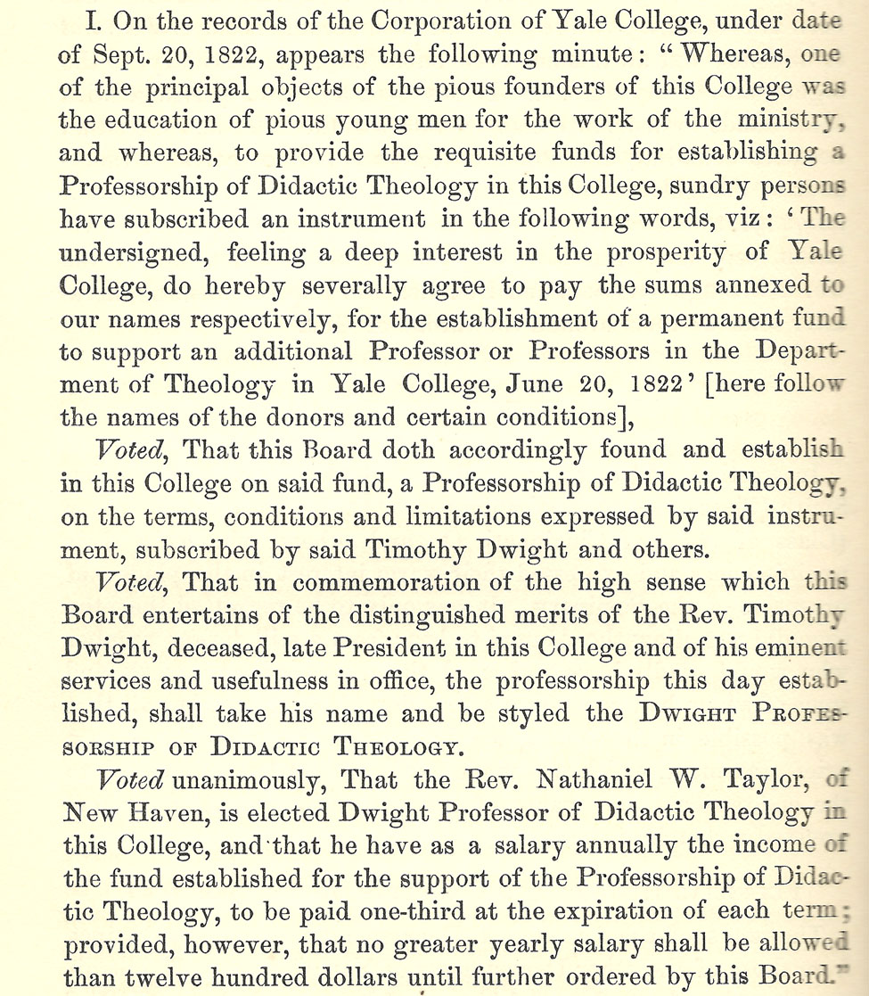 By 1867, Dwight reported assets totaling $250,000, including gifts that endowed the Titus Street Professorship of Ecclesiastical History, Buckingham Professorship of Sacred Literature, Holmes Professorship of Hebrew Language and Literature, and Winkley Professorship in Biblical Theology. "